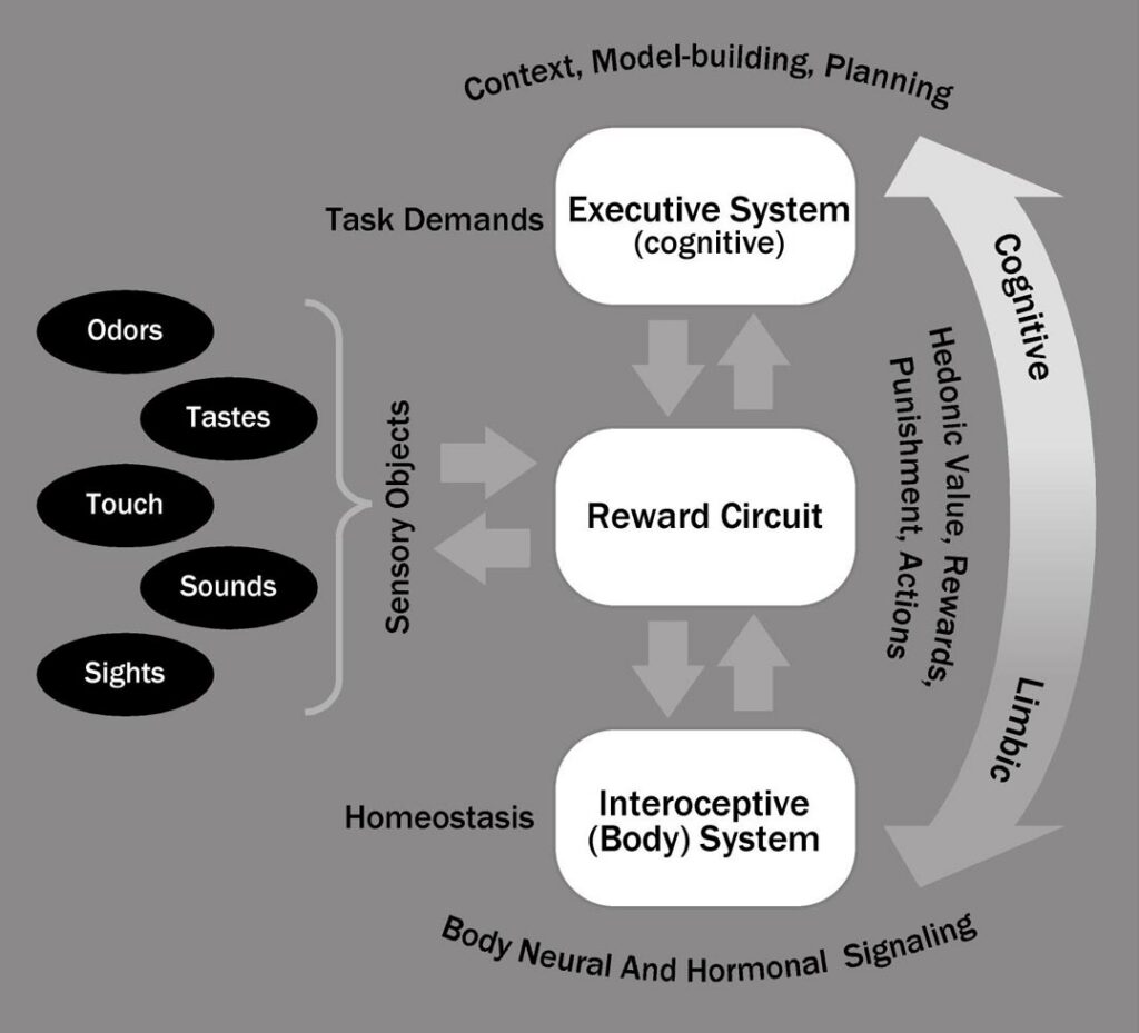 This shows the parts and pieces of the mesocorticolimbic system and the connections between them. At the top are cognitive regions responsible for executive functions like planning and maintaining our model of the world. The interoceptive system monitors the body’s metabolic and physiological state. In-between is the reward circuitry that determines value based on inputs from the senses and elsewhere in the brain and delivers rewards. Adapted from Skov, 2022.